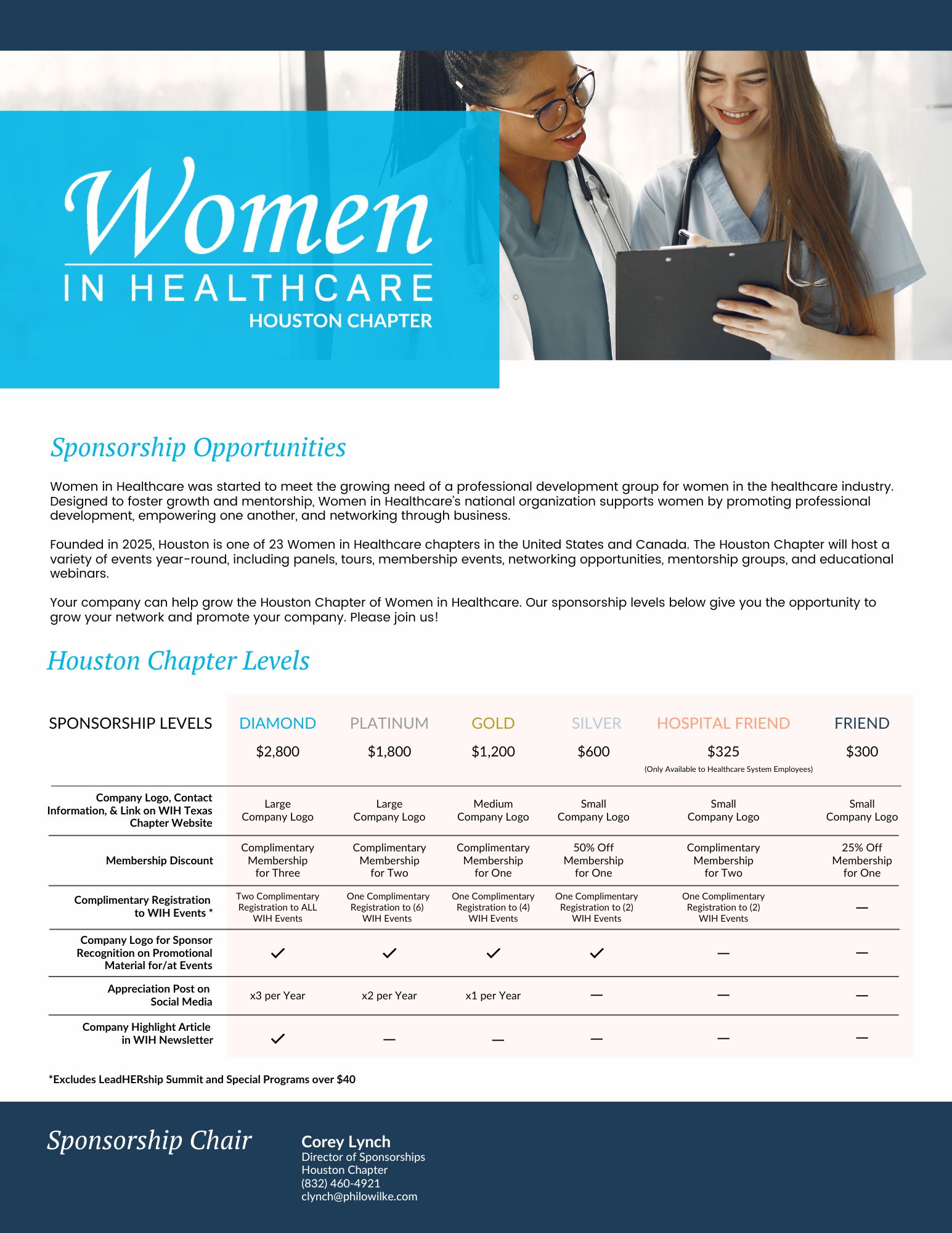 Together, we have an exciting year ahead, made possible by valued sponsors. Enhance your brand recognition while supporting female leaders and innovators in healthcare, creating a robust network of women dedicated to making an impact. Collaborating with you empowers women throughout Texas.